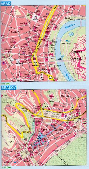 - City plans Arad, Brasov, Cluj-Napoca, Oradea, Sibiu, Timisoara in scale 1:15 000